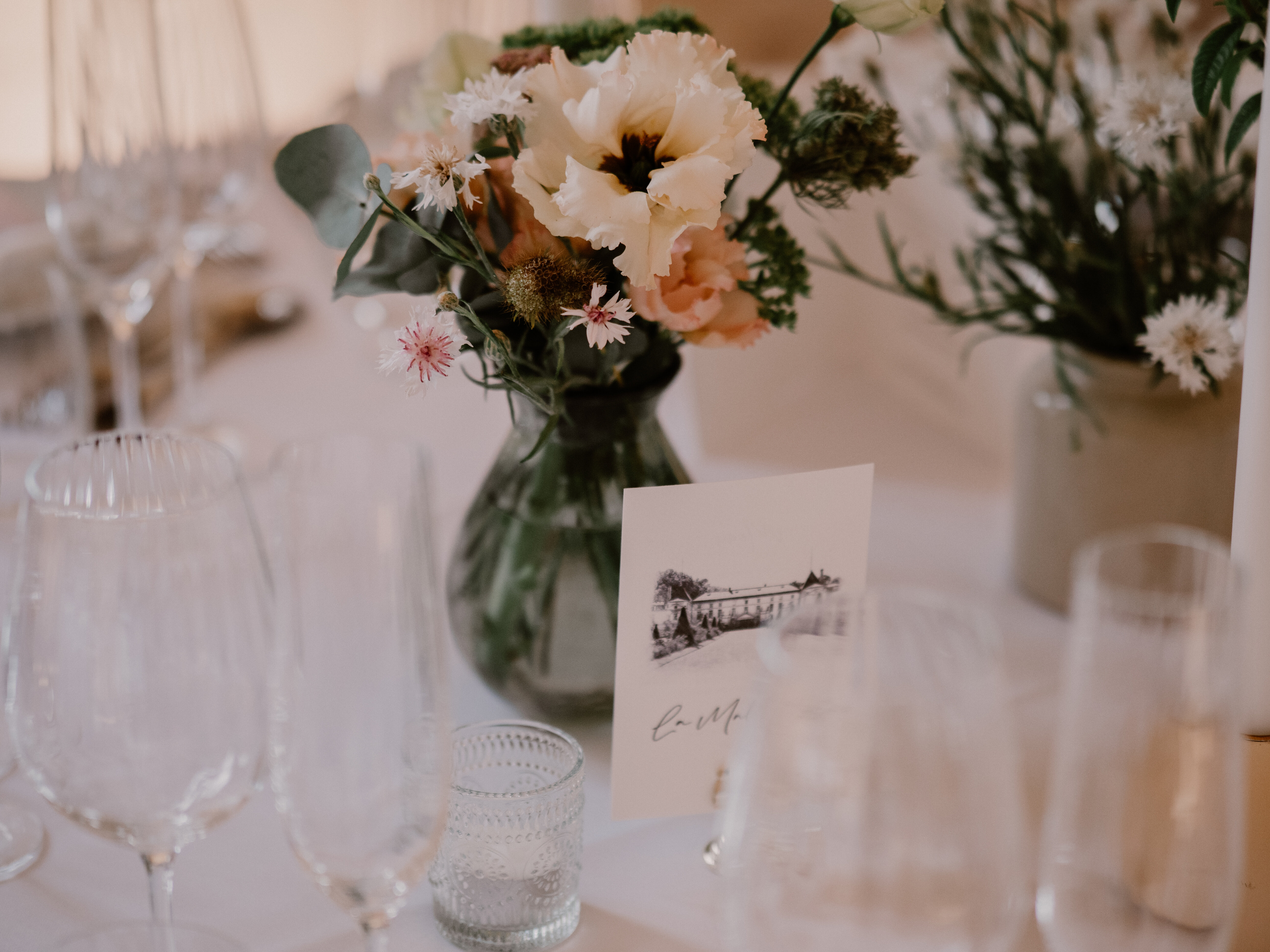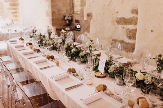 Organisation complète et décoration d'un mariage en Juillet sur le thème de l'Histoire dans des tons blanc, vert et touches de rose poudre.