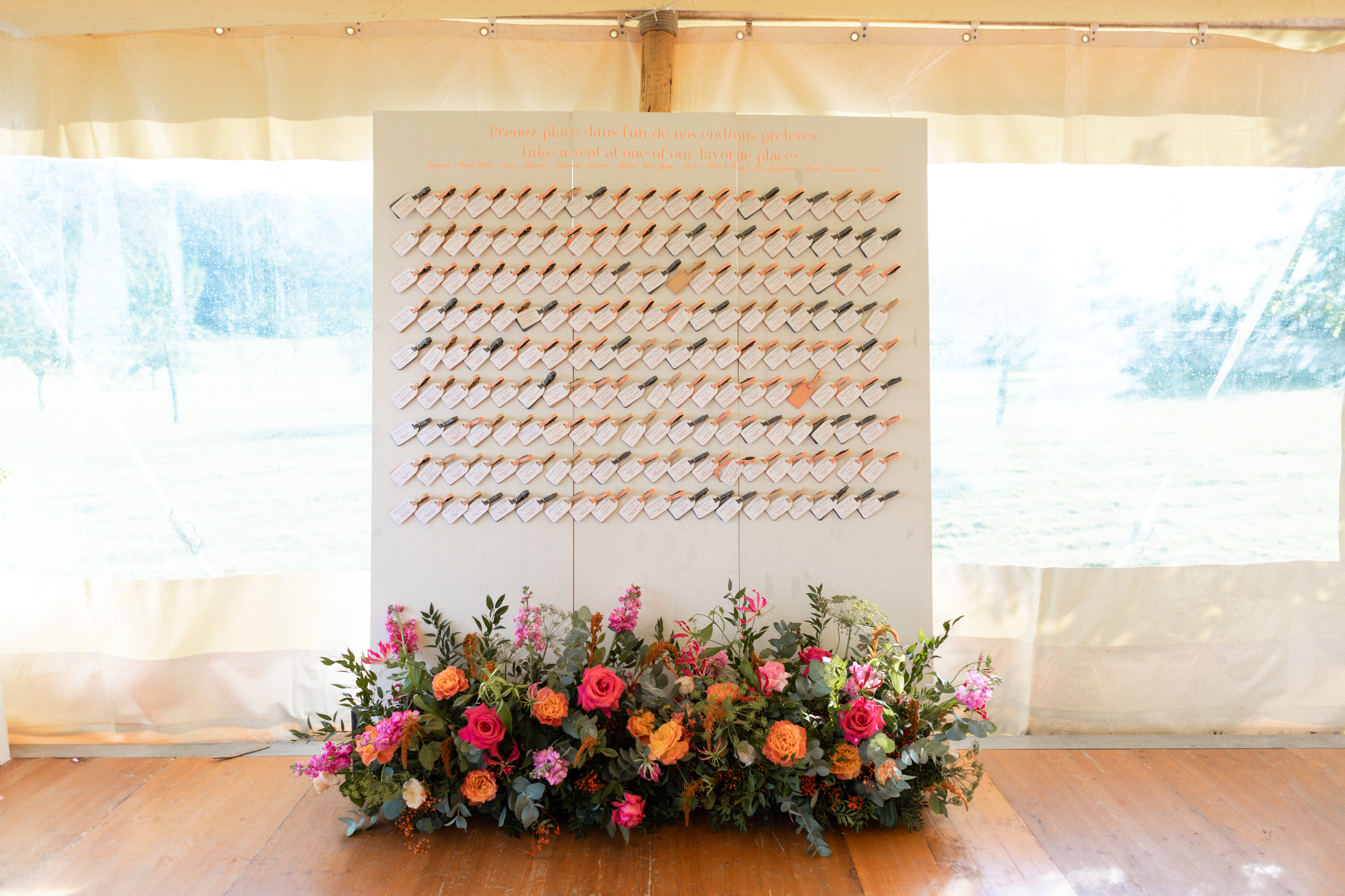 Organisation complète et décoration d’un mariage en Août dans le parc de leur propriété familiale pour un couple franco sino américain, aux couleurs corail sur le thème du voyage.