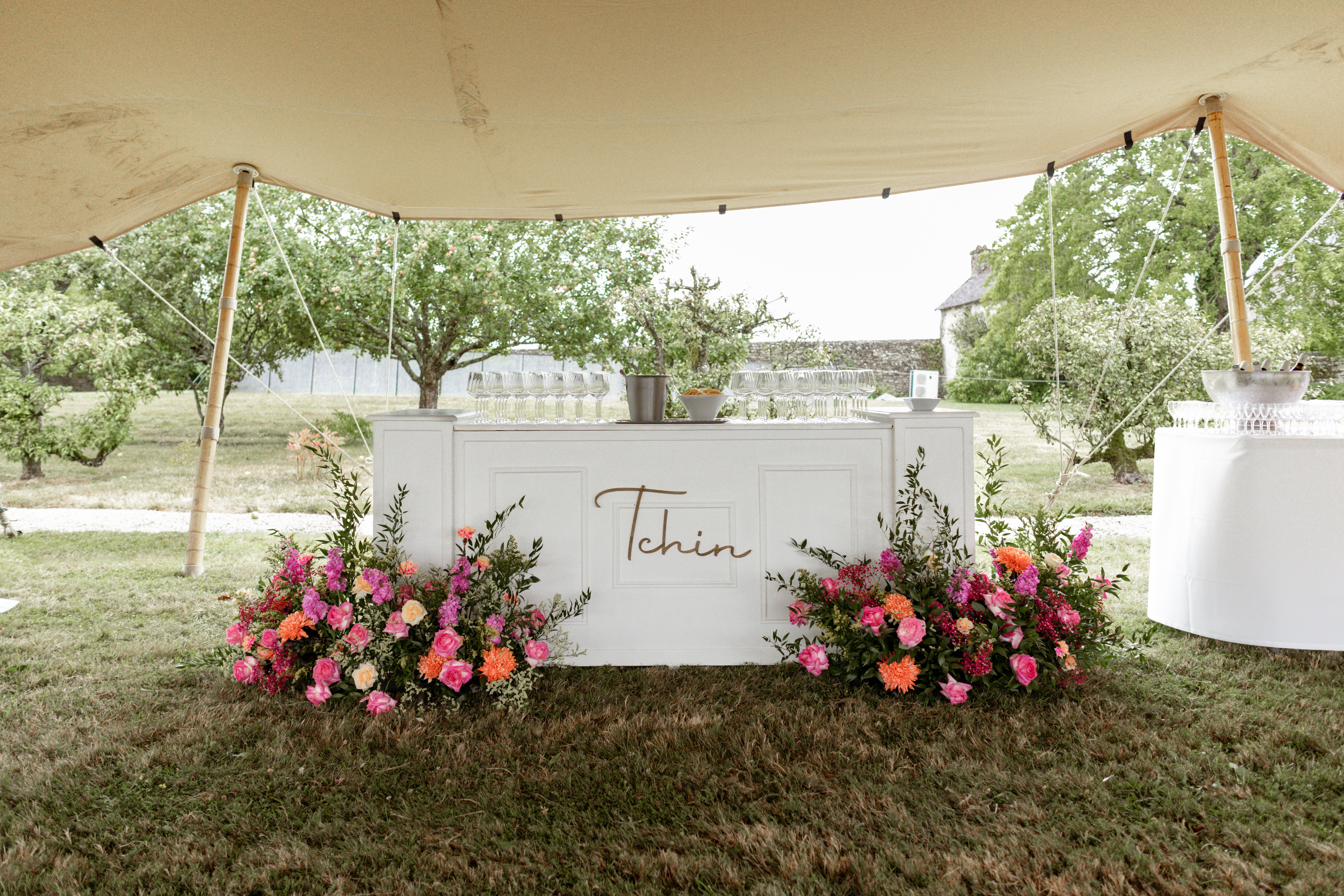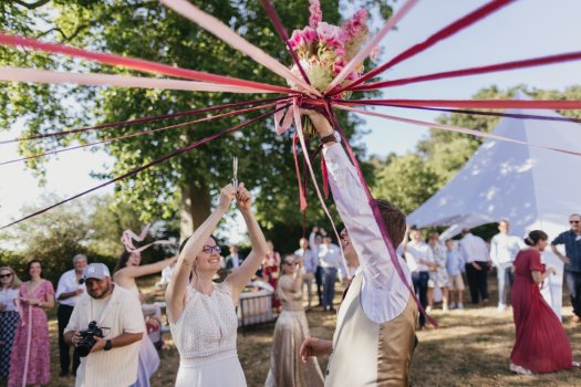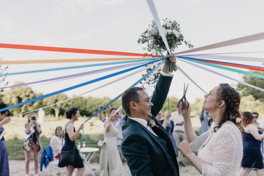 Organisation complète et décoration de mariage en Juin pour un couple originaire du Mans et habitant au Canada, clins d'œil à leur histoire avec des teintes douces et colorées.