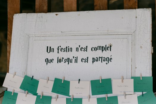 Organisation complète et décoration de mariage dans les tons verts et touche de terracotta ainsi que des clins d'oeil à leur passion respective Harry Potter et les puzzles.